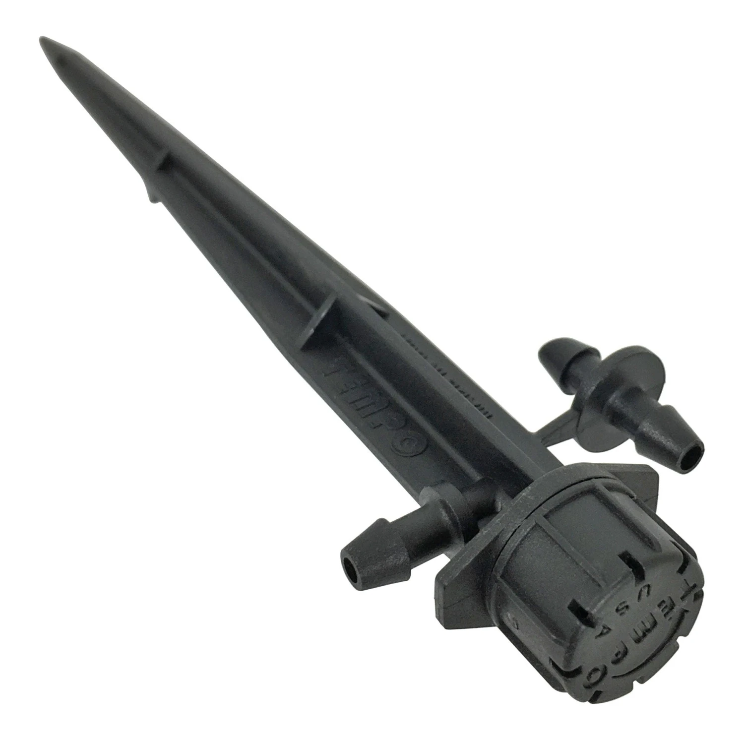 This adjustable spray head is permanently mounted on a 4.5″ riser stake for watering shrubs and trees.